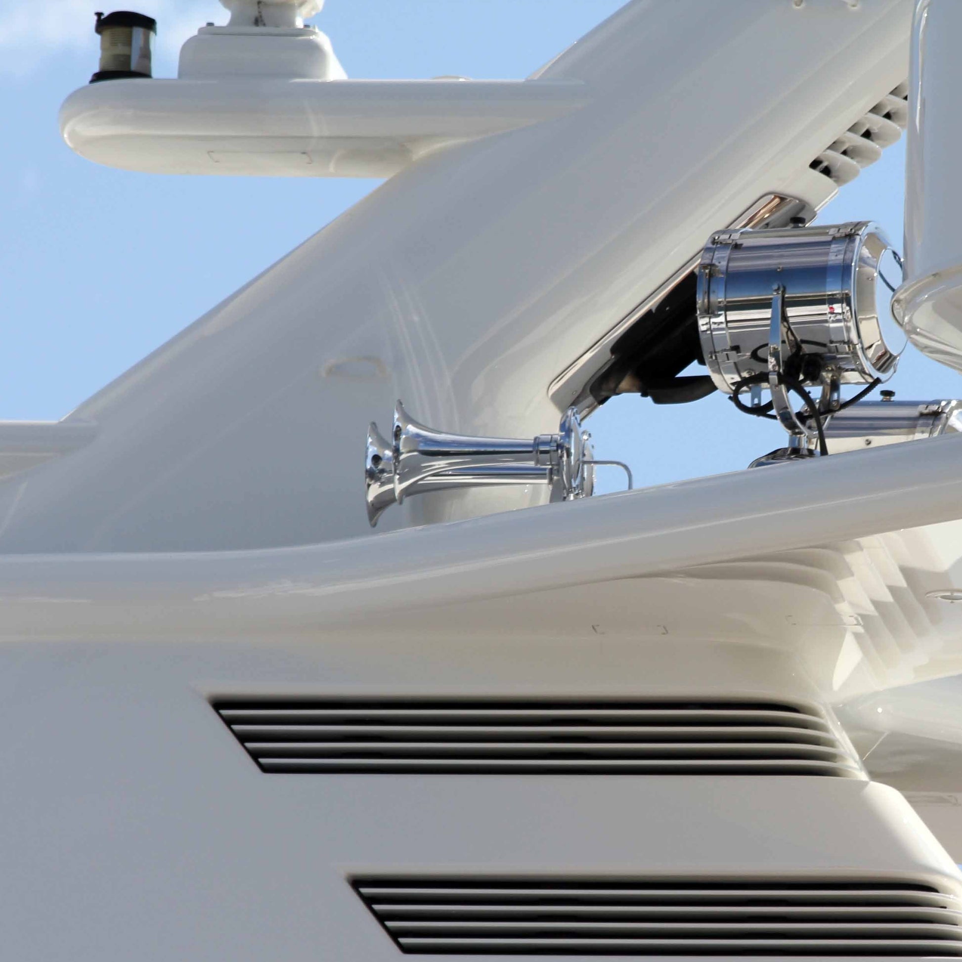 Kahlenberg Chimetone Air Horns all utilize more than one projector or “trumpet” in their design. These projectors each produce a different fundamental frequency which combine to produce powerful, distinctive, musical chords. To hear a Chimetone Air Horn is to realize that the sound of a vessel can be one of its most impressive aspects. The Model D-2 Air Horn is designed for the most discriminating yachtsman. It is made entirely of bronze and brass, and is plated with the highest quality duplex nickel chrome plate finish.