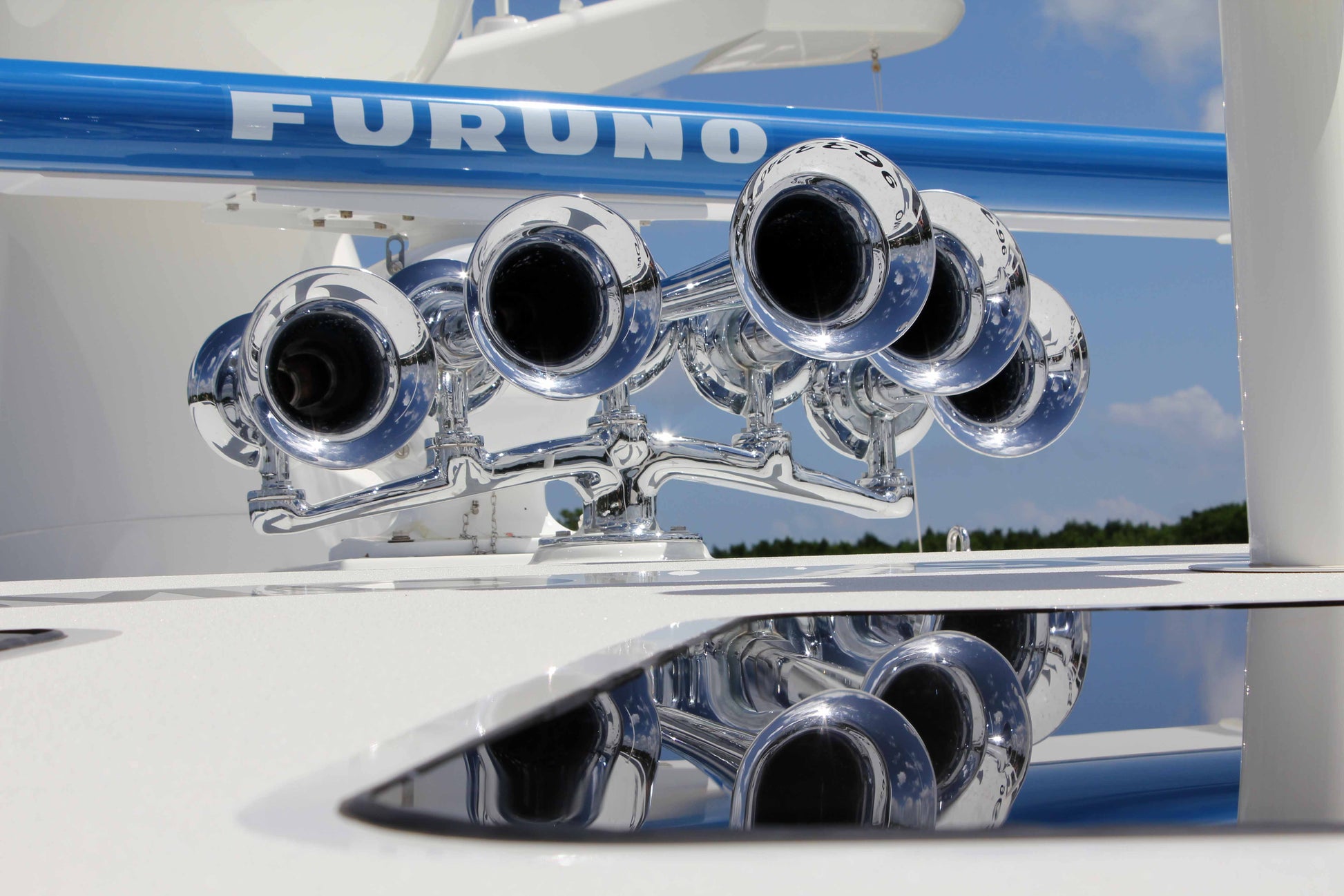 Kahlenberg Chimetone Air Horns all utilize more than one projector or “trumpet” in their design. These projectors each produce a different fundamental frequency which combine to produce powerful, distinctive, musical chords. To hear a Chimetone Air Horn is to realize that the sound of a vessel can be one of its most impressive aspects. The Model F-2 Air Horn is designed for the most discriminating yachtsman. It is made entirely of bronze and brass, and is triple plated for a deep chrome finish.