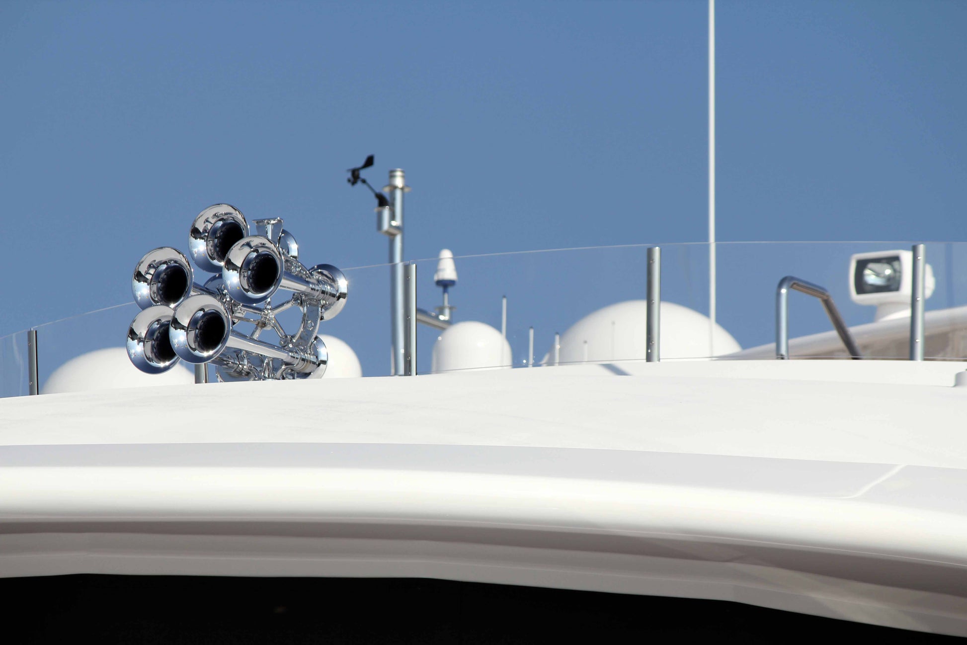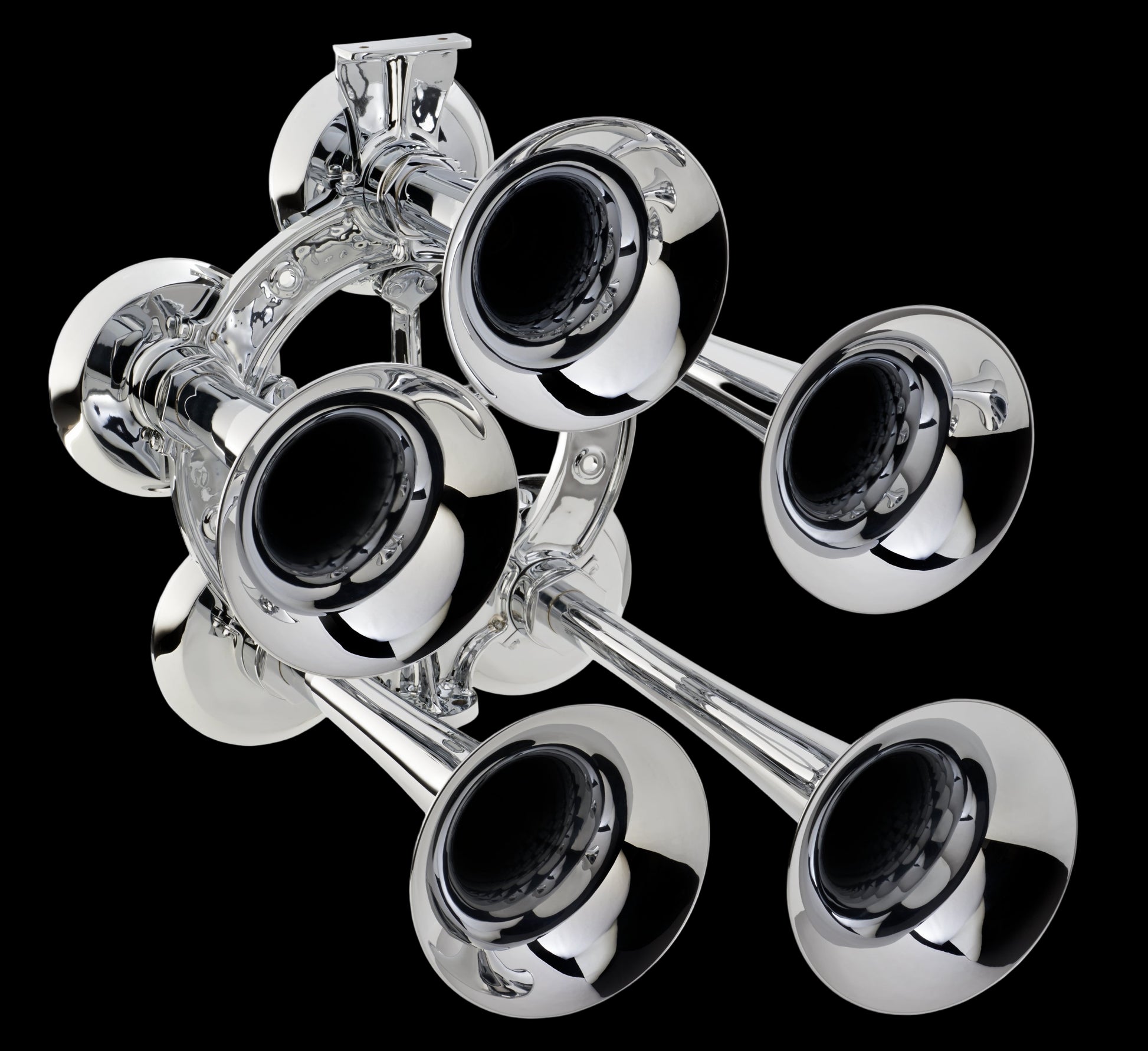 Kahlenberg F-3 Chimetone Air Horns all utilize more than one projector or “trumpet” in their design. These projectors each produce a different fundamental frequency which combine to produce powerful, distinctive, musical chords. To hear a Chimetone Air Horn is to realize that the sound of a vessel can be one of its most impressive aspects. The Model F-3 Air Horn is designed for the most discriminating yachtsman. It is made entirely of bronze and brass, and is triple plated for a deep chrome finish.