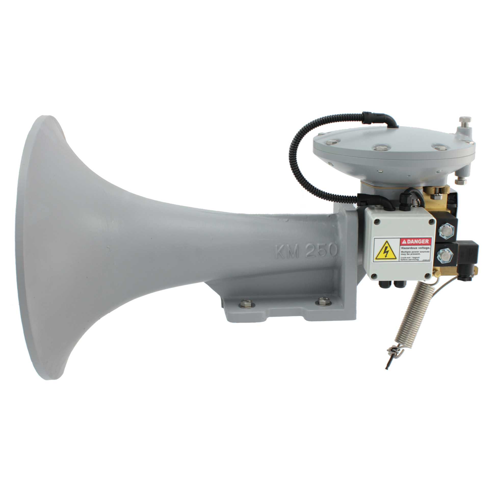Designed for use on commercial and military vessels 75 to 200 meters in length, Kahlenberg KM-DVM-H Air Horns are extremely durable units built for a lifetime of trouble-free service. The KM-250-DVM-H Horn provides a fully IMO compliant sound signal for commercial marine applications in an economical and compact package suitable for use on vessels 75m (246 ft.) to 200m (656 ft). A heated external combination valve assembly and heated diaphragm mechanism reduces weight, product cost, and installation costs while preserving durability and the ability to operate in the most extreme weather conditions.