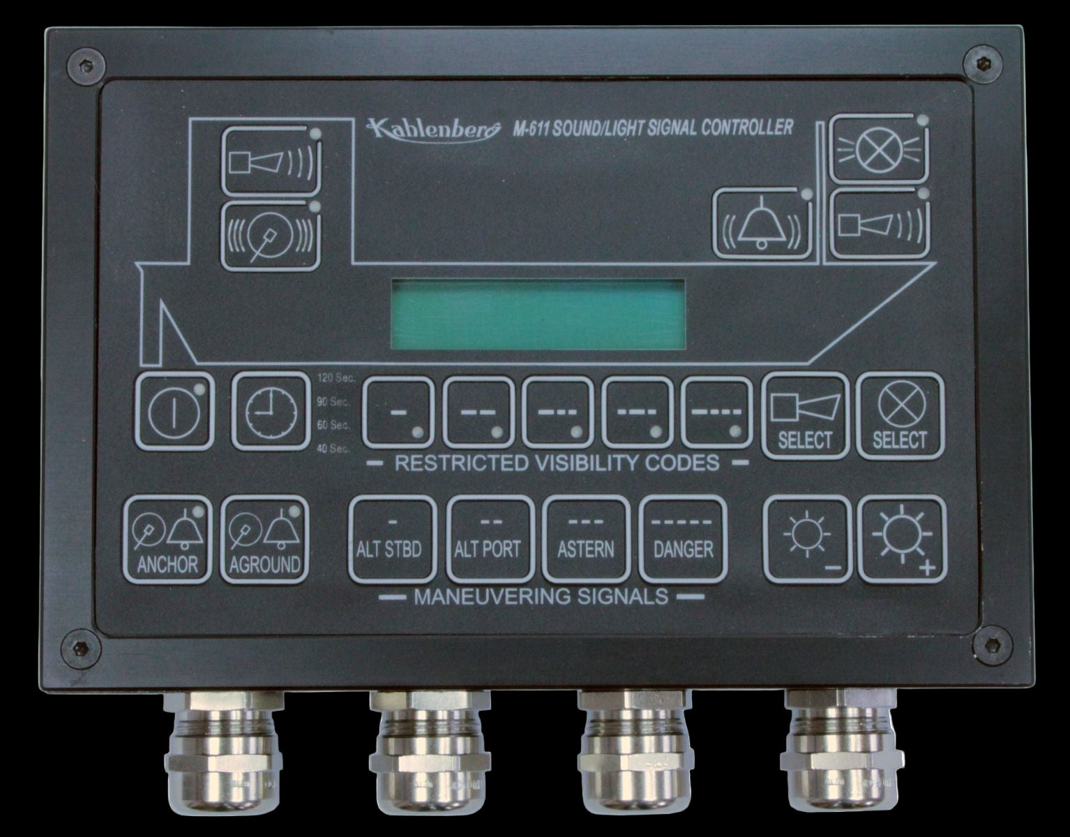 The M-611 Sound and Light Control significantly improves safety by producing automatic sound and light signals required by IMO and SOLAS with a simpler, more user friendly control panel. Producing automated restricted visibility codes, maneuvering codes, general alarm, and abandon ship codes per IMO and SOLAS requirements, the M-522 controls multiple horns, bell and gong, and morse light, and can be configured for use with external alarm systems and sound surveillance systems to suit the needs of almost any arrangement of ship systems.
