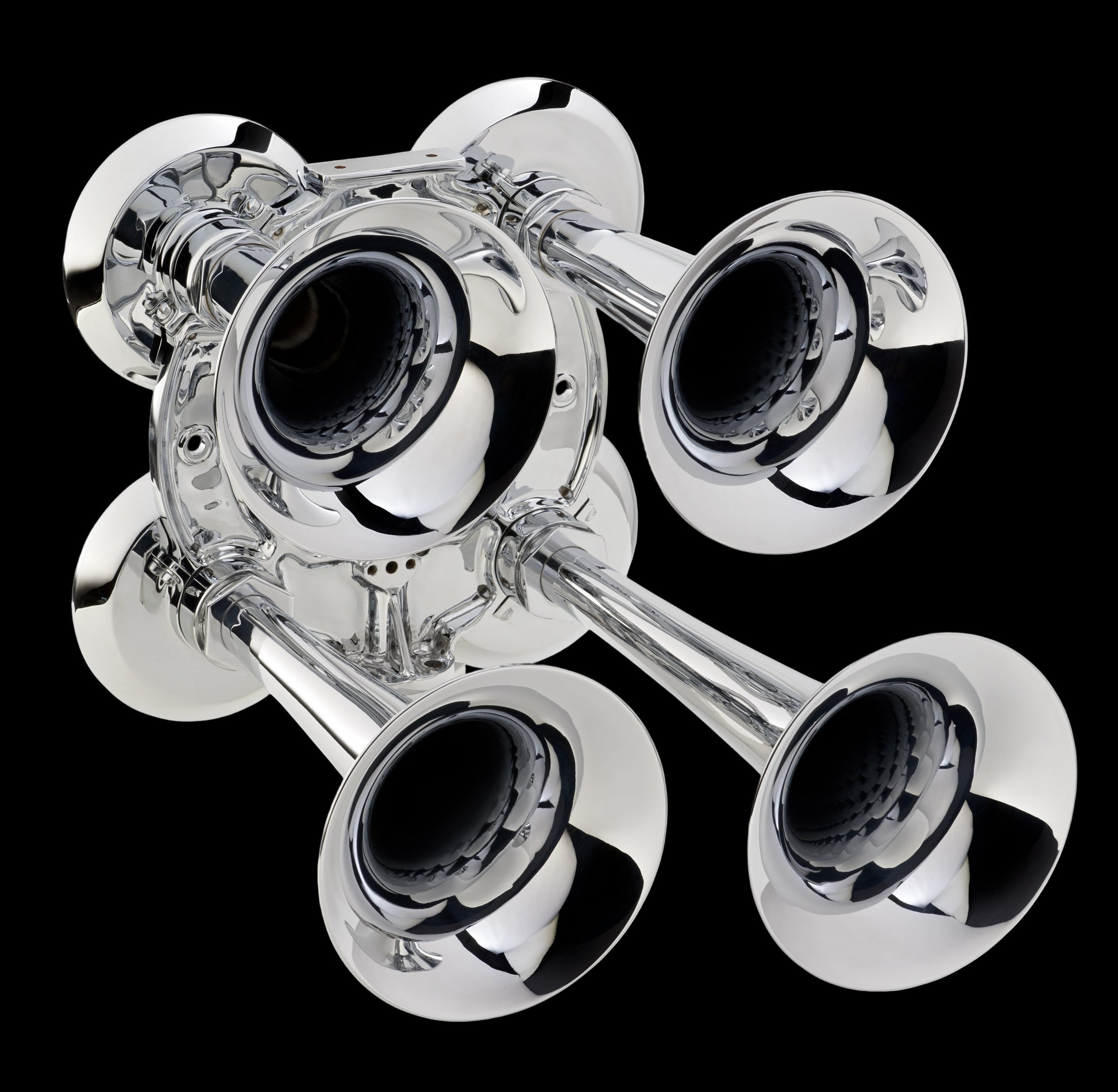 Kahlenberg Chimetone Air Horns all utilize more than one projector or “trumpet” in their design. These projectors each produce a different fundamental frequency which combine to produce powerful, distinctive, musical chords. To hear a Chimetone Air Horn is to realize that the sound of a vessel can be one of its most impressive aspects. The Model Q-3A Air Horn is designed for the most discriminating yachtsman. It is made entirely of bronze and brass, and is triple plated for a deep chrome finish.